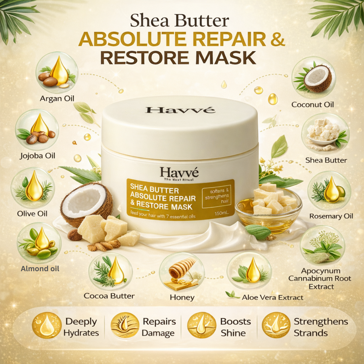 Our Shea Butter Absolute Repair & Restore Mask is a luxurious deep conditioning treatment enriched with 7 essential oils and Shea Butter. This potent blend is specially formulated to repair damaged hair, restore hydration, and rejuvenate dry, brittle strands, giving your hair softness, shine, and strength from root to tip.
